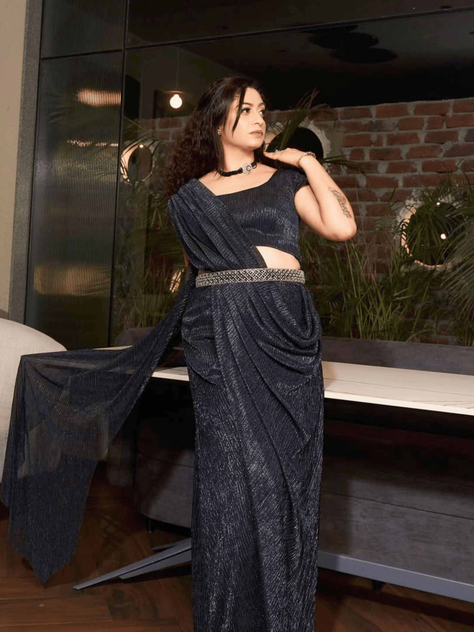 A sleek draped gown with a modern blouse-style top and flowing silhouette. The shimmering black tone adds depth and mystery, making it perfect for a confident, statement evening look.