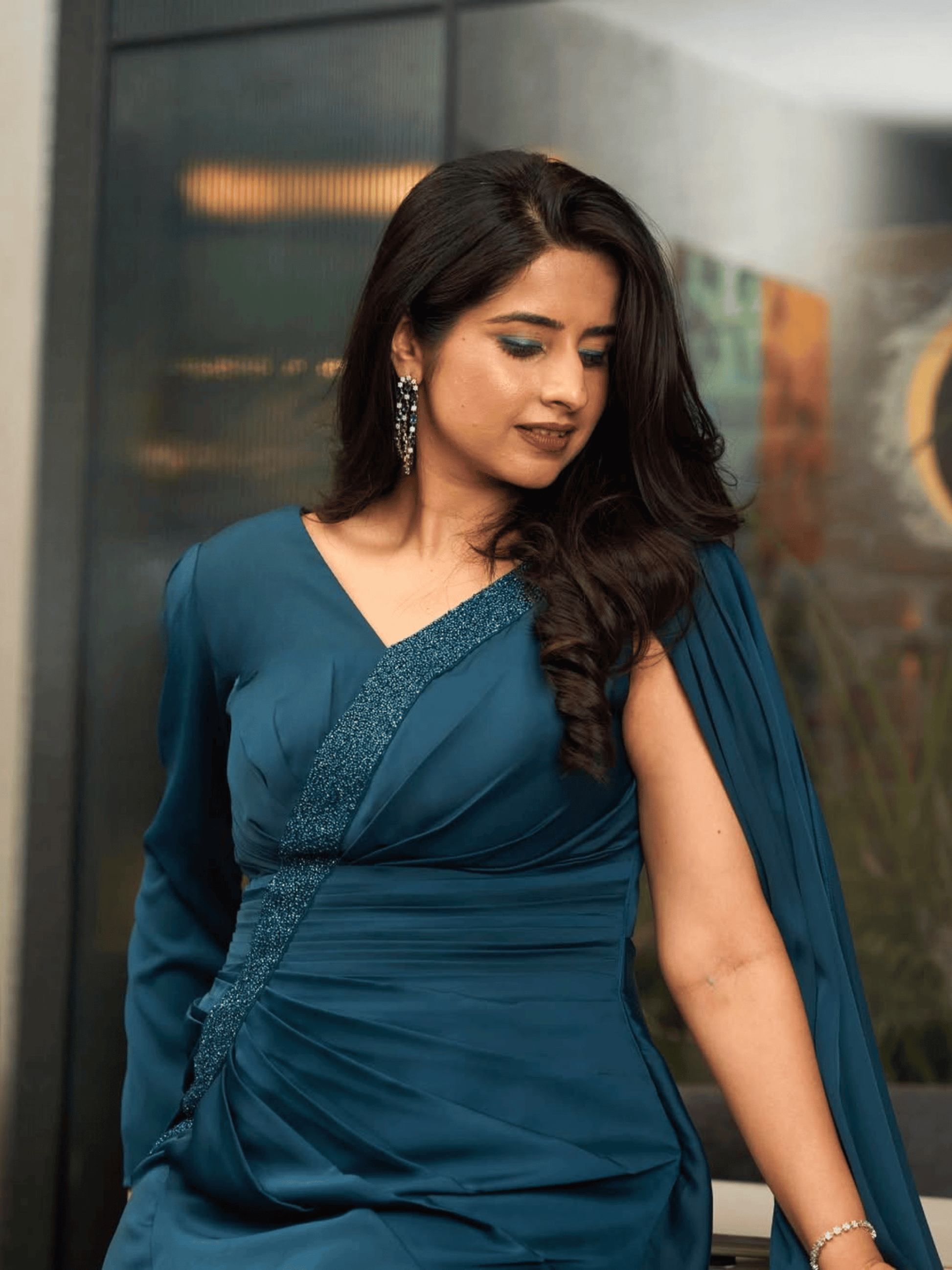 A stunning teal satin gown with a beautifully draped silhouette and an attached flowing cape sleeve. Its sleek fit and soft shimmer detailing create a refined, graceful look—perfect for elegant evenings and special occasions.